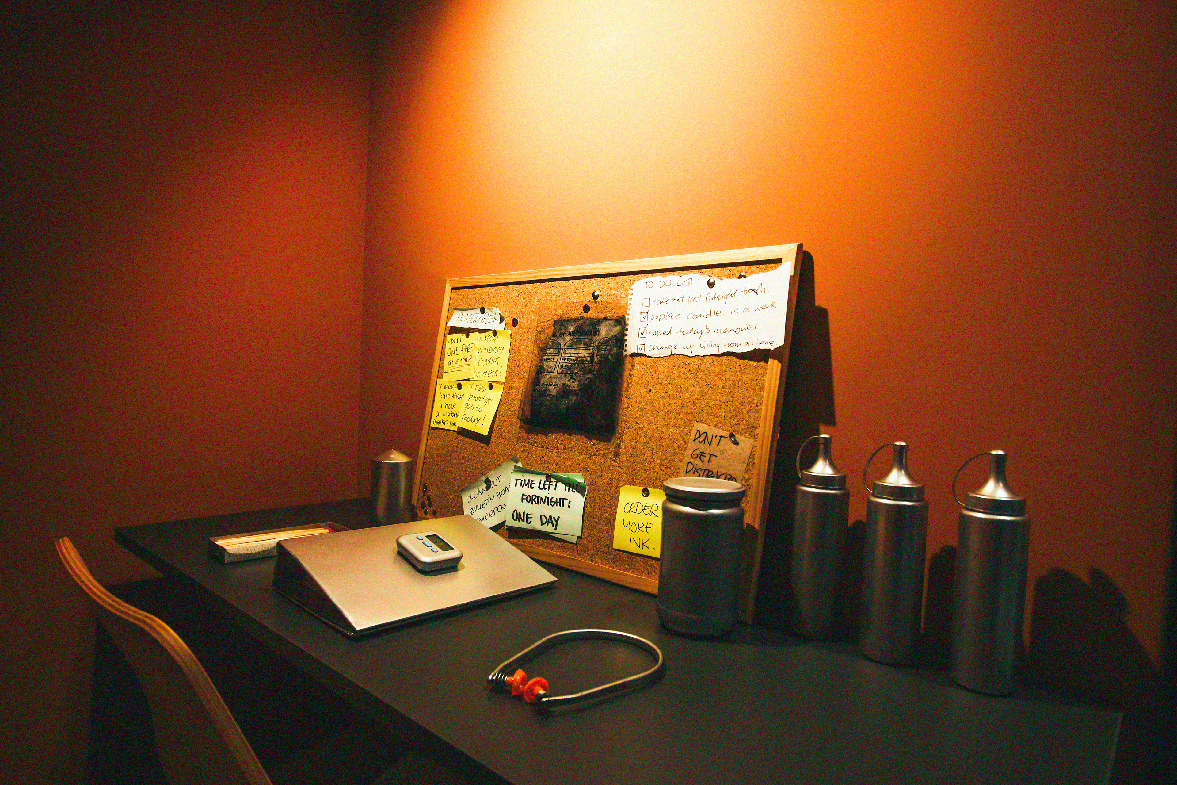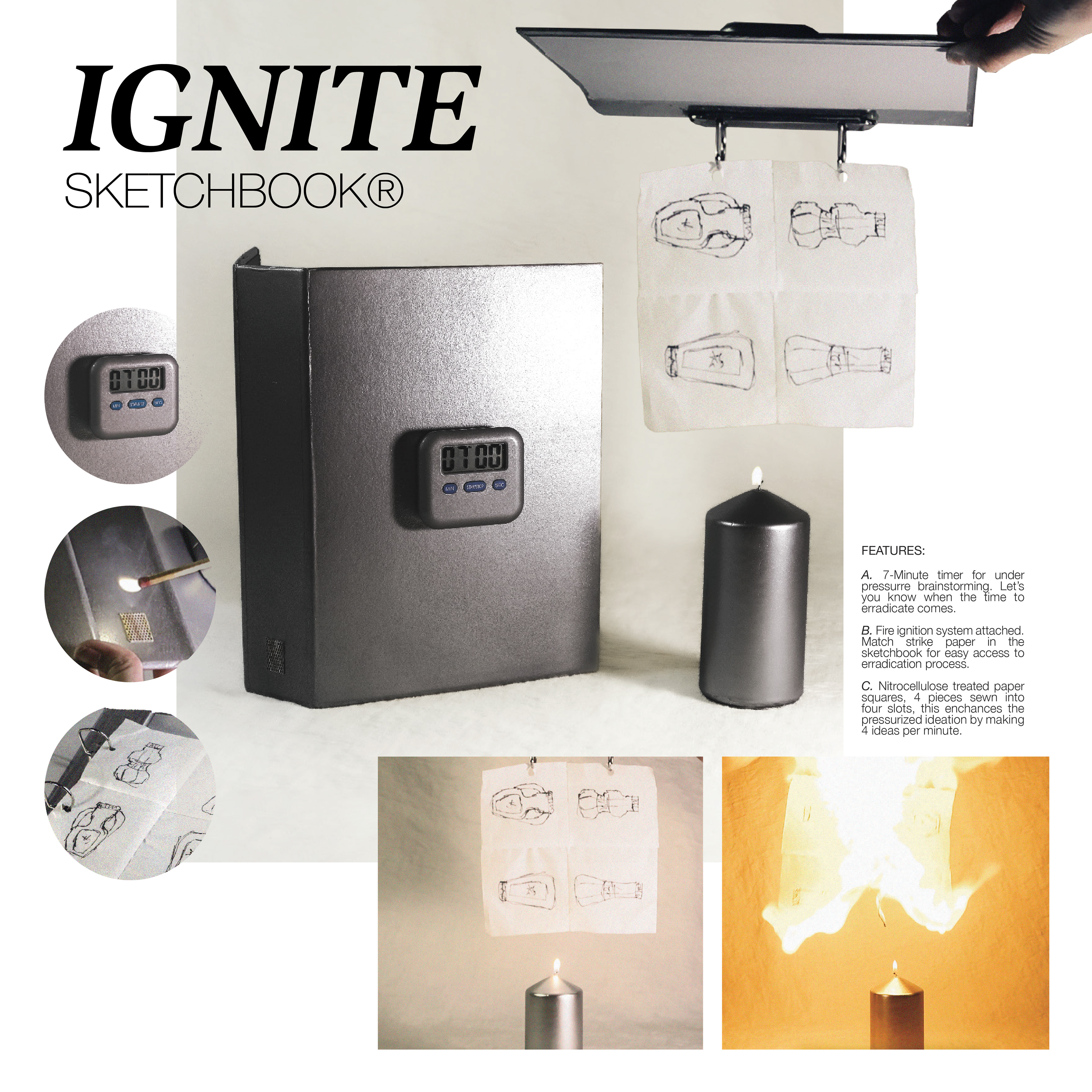 7-Minute timer for under-pressure brainstorming. Lets you know when the time to eradicate comes. A fire ignition system is attached, and for it's key function... A match strike paper is in the sketchbook for easy access to the eradication process, along with the star of the Ignite Sketchbook, the nitrocellulose treated paper squares, 4 pieces sewn into four slots, to enhance the pressurized ideation by making 4 ideas per minute.
