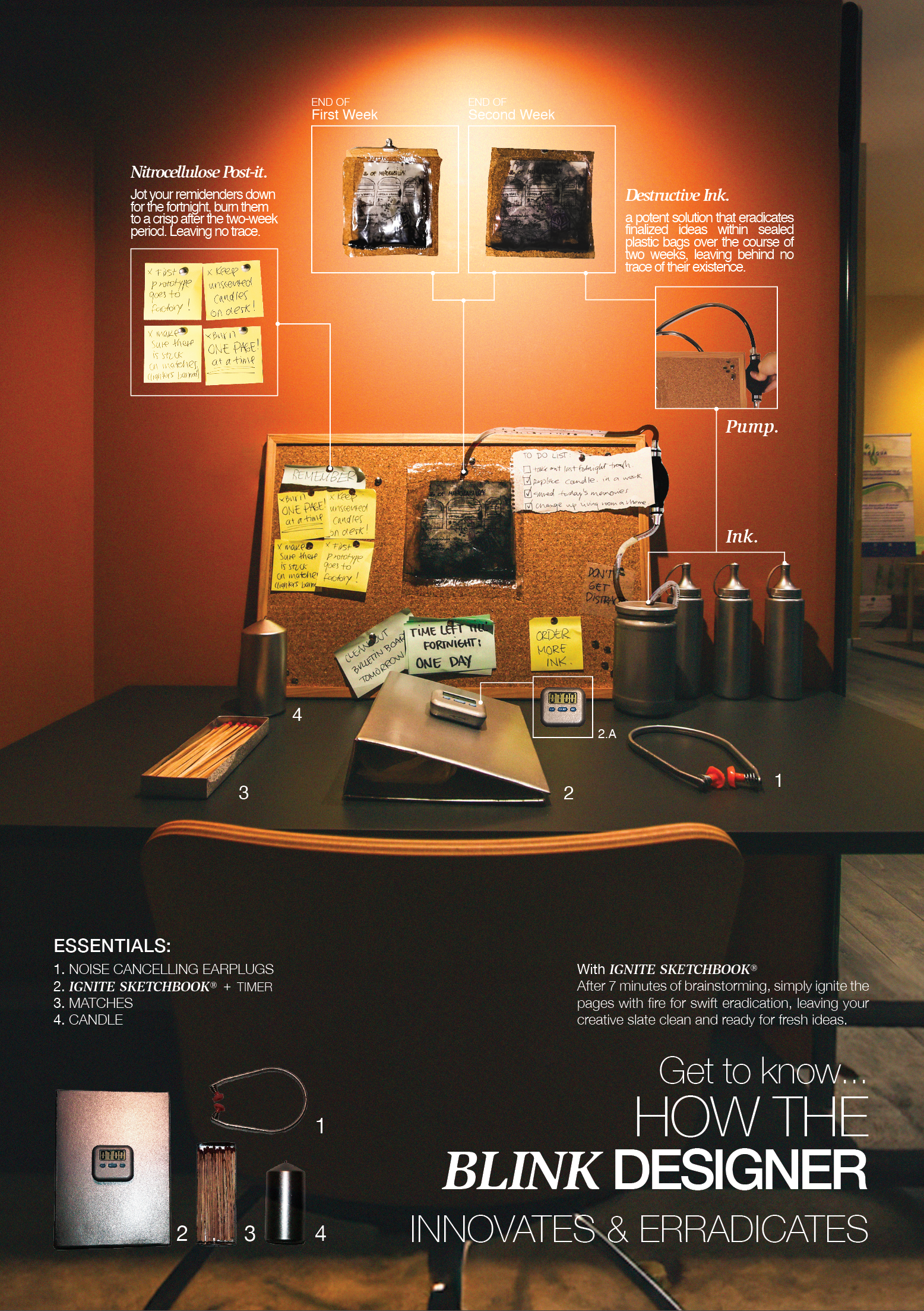 In the whirlwind of Blink Design’s short-term design process, efficiency reigns supreme. With strict time management, projects are confined to two-week spans, with each page of the sketchbook allotted a mere minute for brainstorming. Utilizing quick references and moodboards within the time frame, prototypes are swiftly developed without extensive research, the culmination of our process; these initial prototypes are sent for production without further review, reflecting our commitment to speed and immediacy. The pivotal moment arrives in eradication, executed through various methods like fire or ink, symbolizing the ephemeral nature of our design cycle.