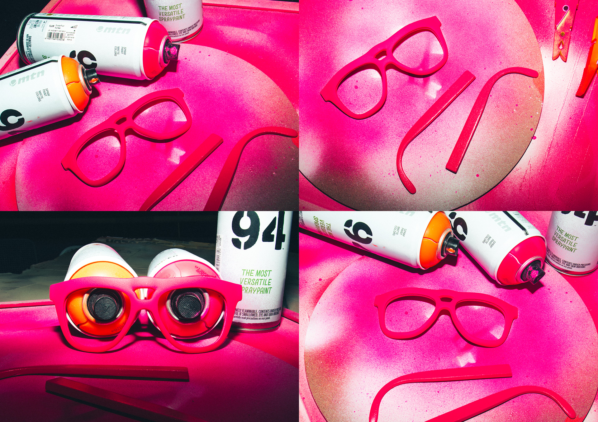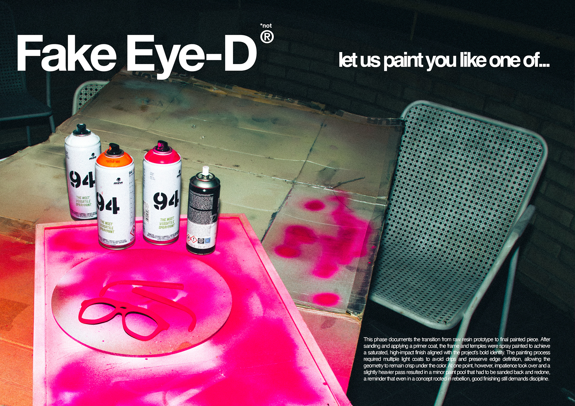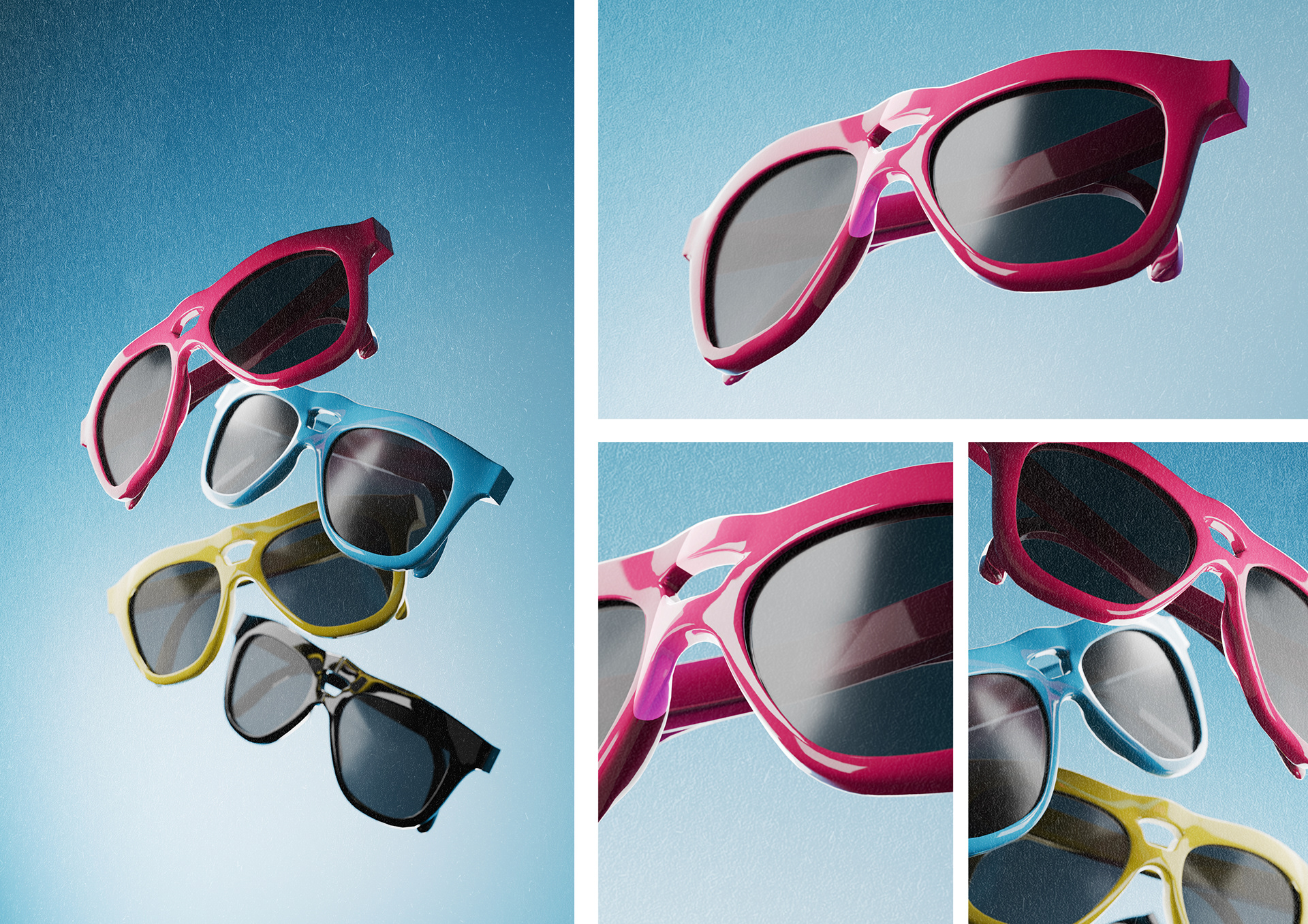 The frame was digitally modeled in Blender and prototyped using SLA resin 3D printing. Iterative testing included head-scan scaling, hinge tolerance validation, proportion refinement, and surface finishing trials. The final prototype integrates product feasibility with a cohesive visual identity system inspired by CMYK logic.